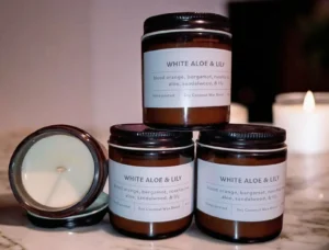 White Lily & Aloe is a clean, spa-like soy candle with notes of citrus, soft florals, and warm sandalwood. I pour it for quiet spaces, gentle rhythms, and a steady flame that comforts without overpowering.